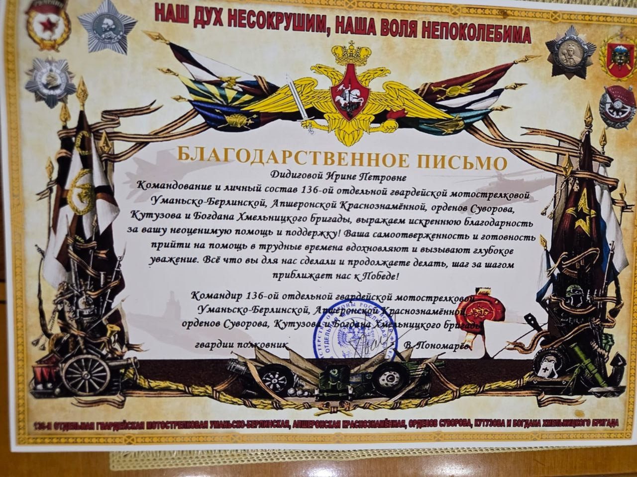 Гости приехали не с пустыми руками: от имени своего командования вручили волонтёрам Благодарственные письма. И.П. Дидигову наградили также медалью «За помощь фронту».