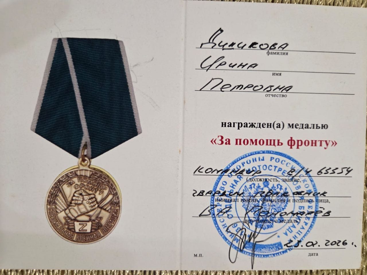 Ирина Петровна с самого начала специальной военной операции направляет гуманитарную помощь в зону СВО для военнослужащих и жителей Новороссии. Вместе с соседями плетёт маскировочные сети, помогает раненым в госпиталях.